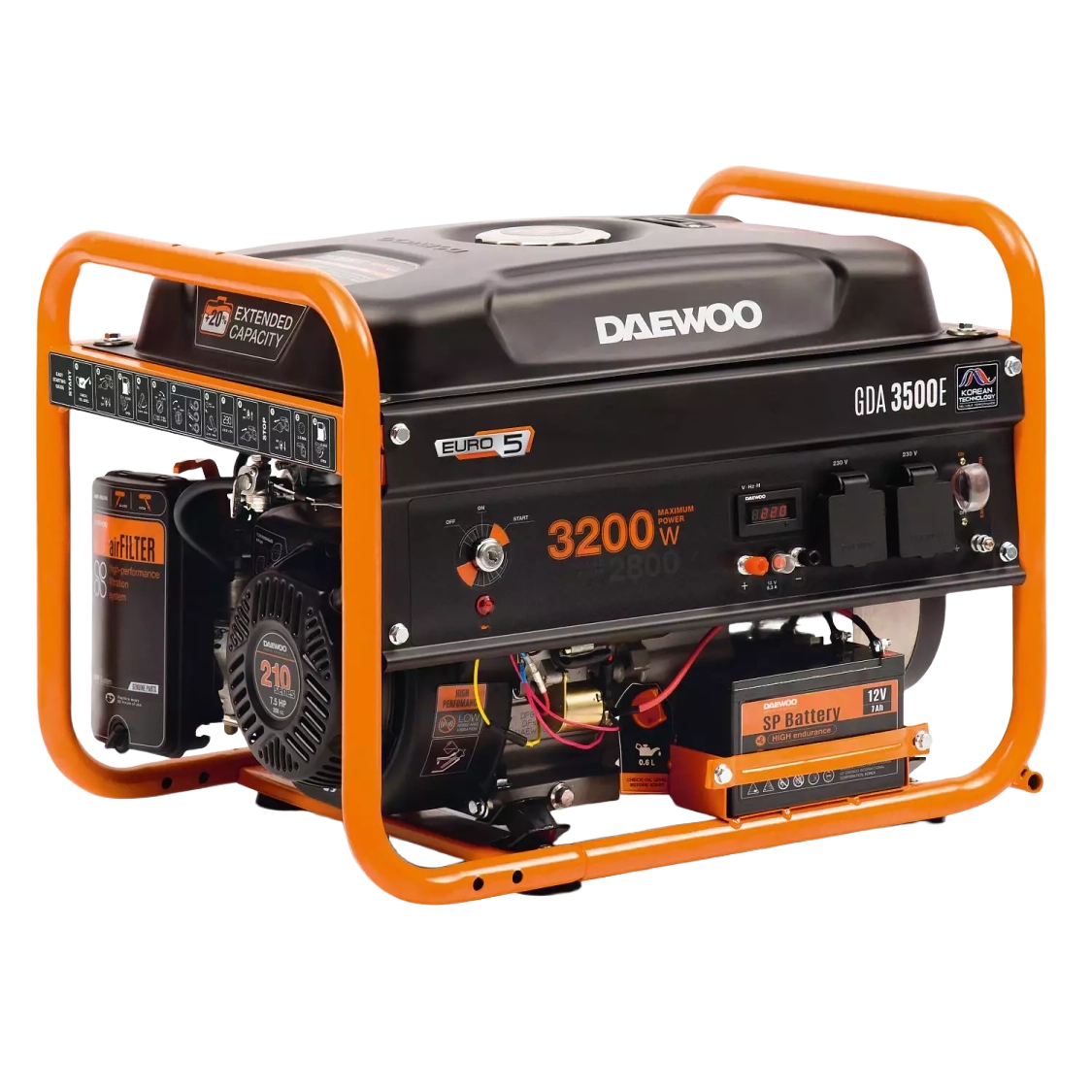 Agregat prądotwórczy DAEWOO GDA 3500E z elektrycznym starterem to wydajne urządzenie do generowania prądu elektrycznego. Sprawdzi się wszędzie tam, gdzie nie ma dostępu do sieci elektrycznej. Może zapewnić zasilanie w niewielkim domu, na działce rekreacyjnej, kempingu czy placu budowy. Agregat został wyposażony w wyświetlacz pozwalający kontrolować parametry i jakość prądu wyjściowego, a także akumulator 12 V z wbudowanym rozrusznikiem, dzięki któremu urządzenie można uruchomić przekręcając kluczyk. W agregacie został zastosowany powiększony zbiornik paliwa. Pozwala wydłużyć czas ciągłej pracy na jednym tankowaniu do 15 godzin. Zbiornik został pokryty specjalną matową farbą odporną na korozję i oddziaływania chemiczne.